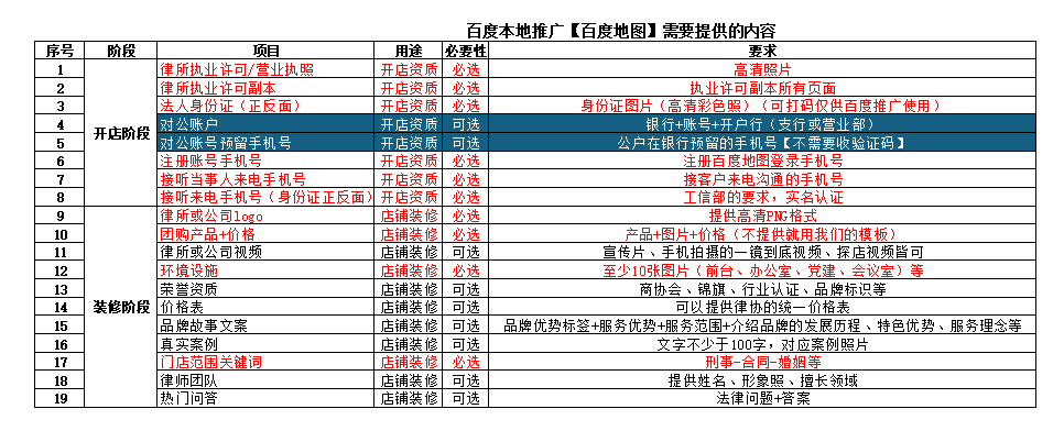 装修需要提供资料 目录: 百度本地推广服务 标签: 律临, 律师, 律师推广, 律所, 案源, 法律, 百度, 百度代运营, 百度律临, 百度推广 发表日期: 21 3 月, 2026 姓名 电话 公司名称 城市 咨询合作 百度本地推广(百度地图)装修店铺资料: 1.环境:logo、门头照、办公室、党建、会议室(≥10张照片) 2.视频:宣传片(或手机一镜到底视频) 3.荣誉:旌旗、聘书、奖项【ALB、钱伯斯】 4.品牌:品牌故事、发展历程、品牌logo、品牌简介 5.交通:到所的指引图(停车、开车路线、大堂楼层+门禁操作) 6.收费:收费标准(张贴在墙上律协要求的内容) 7.律师:高清形象照+简历3-7位 8.主推律师:律师的背景【学历、年限、荣誉、政法履历等卖点】 微信扫码分享 相关文章 客户入驻效果【入驻1周】 精选效果案例 FAQ
