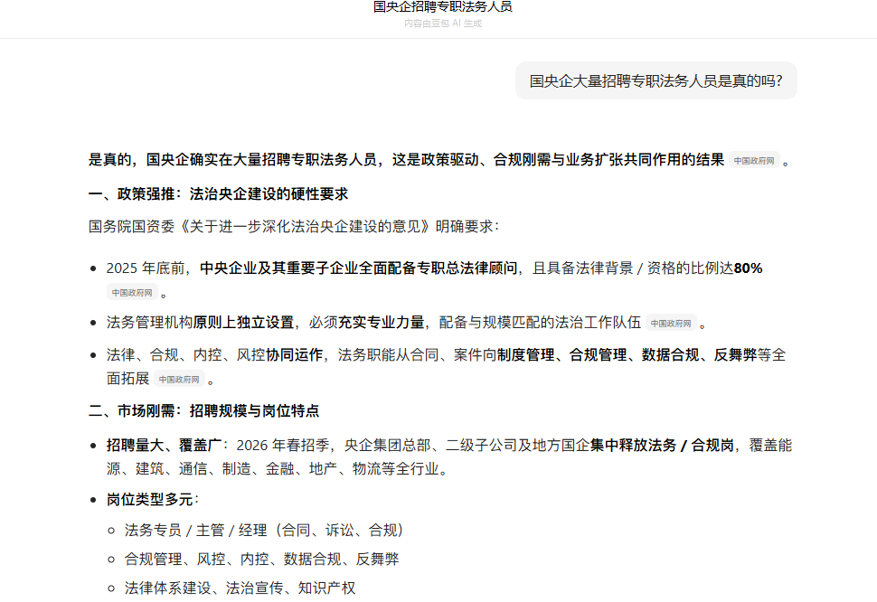 国央企确实在大量招聘专职法务人员,且该趋势在2026年持续加强,对律师的行业来说更是雪上加霜。